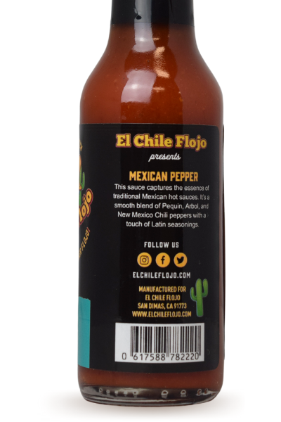 Our Mexican Hot Sauce truly captures the essence of all traditional Mexican hot sauces. It's a smooth blend of Pequin, Arbol, and New Mexico Chili peppers combined with a blast of aged red peppers. This sauce is rated a spicy level 5 out of 10.